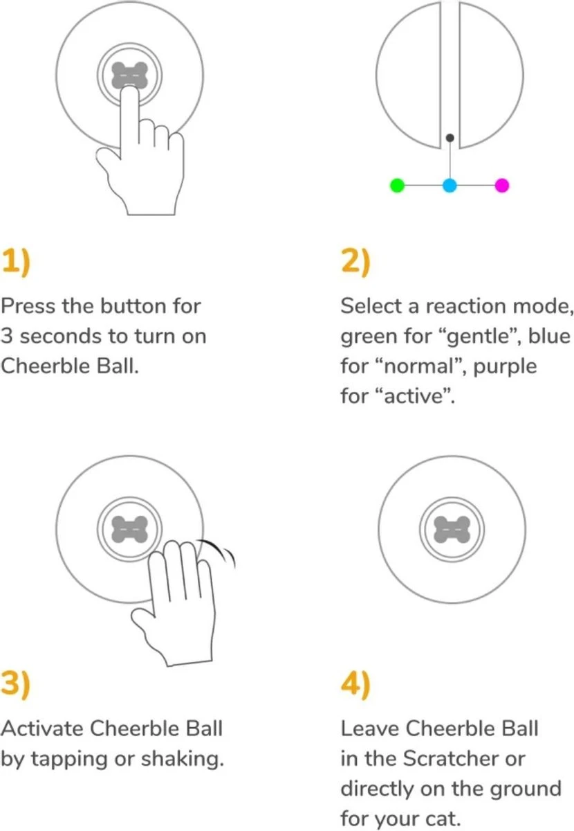– Blauw: normale speelmodus (de bal rolt langzaam om de kat uit te dagen en zal interacteren zodra de kat de bal aanraakt)