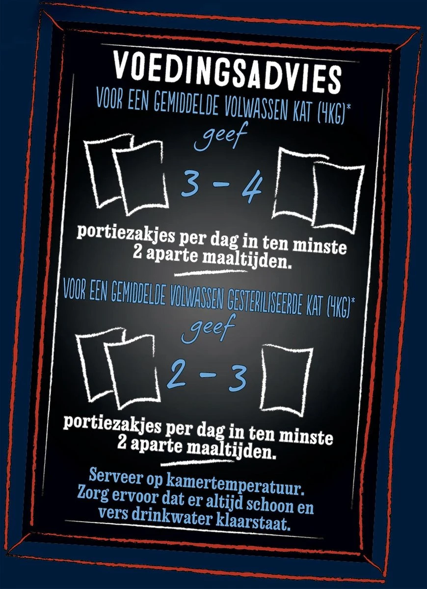 | Voedingsadvies | Voor een gemiddelde volwassen kat (4kg) geef 3 tot 4 portiezakjes per dag in ten minste 2 aparte maaltijden. De gemiddelde hoeveelheden voor volwassen katten zijn gebaseerd op matig actieve katten bij normale omgevingstemperaturen. Individuele behoeften verschillen echter en de voeding dient hierop te worden aangepast om de kat op een slank, gezond lichaamsgewicht te houden. Serveer op kamertemperatuur. Zorg ervoor dat er altijd schoon en vers drinkwater klaarstaat. Bewaar diervoeder op een koele en droge plaats. Ten minste houdbaar tot, partijcodering en registratienummer. zie onderkant verpakking zie codering aan de bovenkant van de achterkant verpakking |