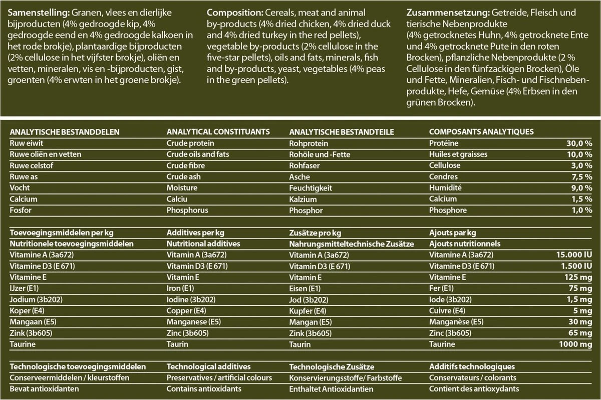 Granen, vlees en dierlijke bijproducten (4% kip, 4% eend-wild in de rode brokjes en 4% kalkoen in neusje naturel brokjes), plantaardige bijproducten (2% cellulose in de 5 ster brokjes), Oliën en vetten, mineralen, vis en visbijproducten, gist en groenten (4% groenten in de groene brokjes).