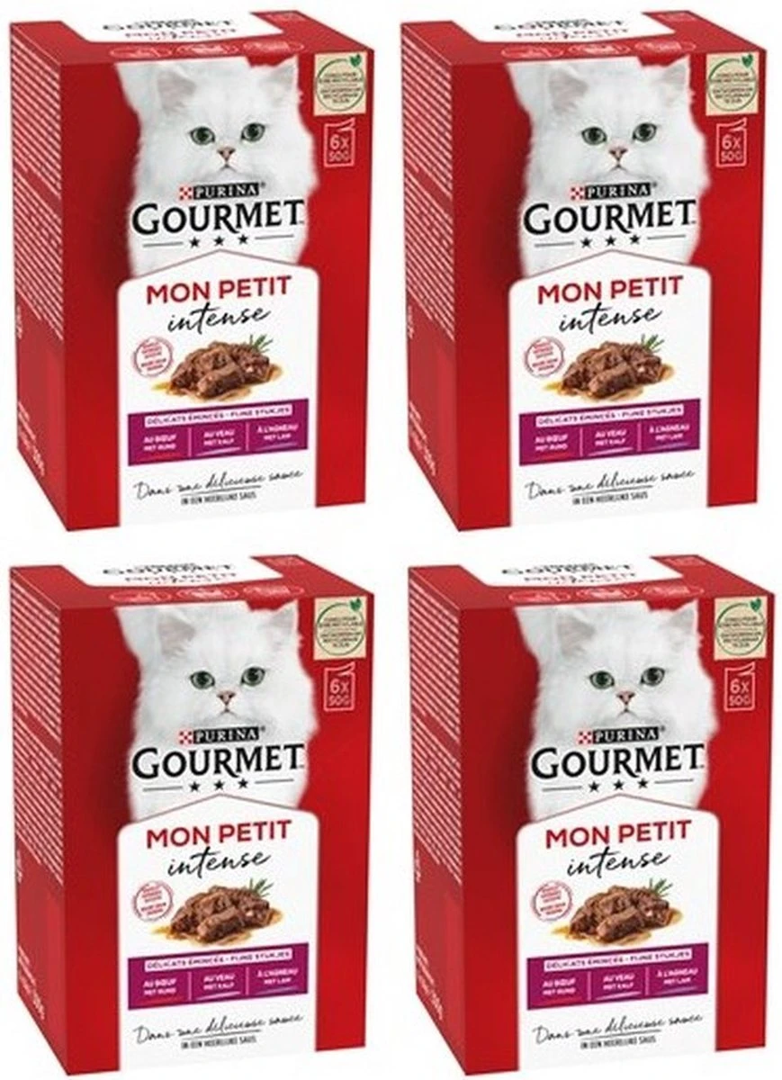 Gourmet Mon Petit Intense Vlees-selectie GOURMET™ Mon Petit Intense, een verfijnde verzameling van werkelijk verrukkelijke recepten die de essentie van smaak vieren. Gemakkelijk te openen, gemakkelijk te serveren, zonder restjes en in een recyclebaar maaltijdzakje. Al onze heerlijke recepten zijn 100% volledig en gebalanceerd voor volwassen katten.