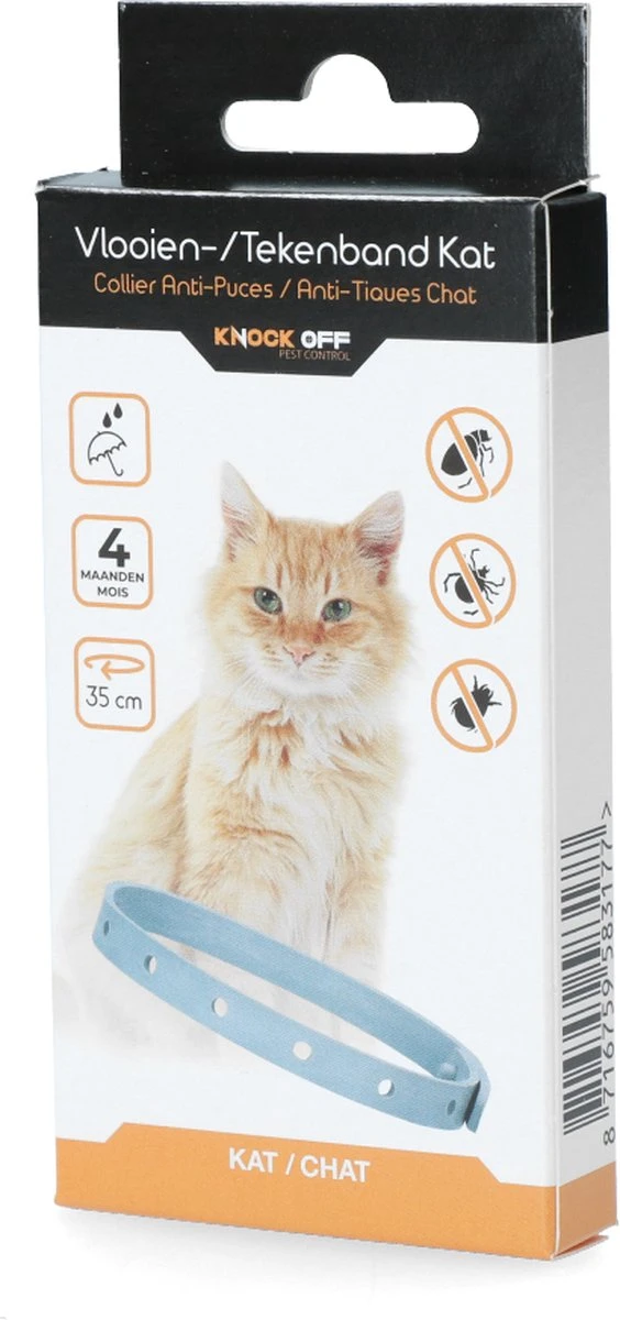 De Knock Off vlooien/teken band is geschikt voor katten en is 100% gifvrij. De vlooienband is regenbestendig en heeft een fysieke werking op zogenaamde ectoparasieten, en is tot wel 4 maanden werkzaam. De Knock Off vlooienband voor katten maakt parasieten immobiel, waardoor ze uitdrogen. De waterbestendige vlooien- en tekenband bevat geen insecticiden, waardoor hij veilig is voor mens en dier.