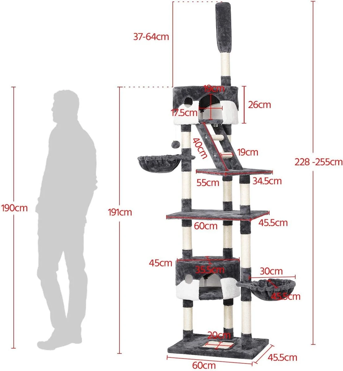 Kattenkrabpaal: Met deze kattenkrabpaal kunnen twee tot drie katten samen spelen. De maximale hoogte van 255 cm zorgt ervoor dat je kat voldoende bewegingsruimte heeft. Je kat kan op hoogte goed en duidelijk overzicht krijgen.