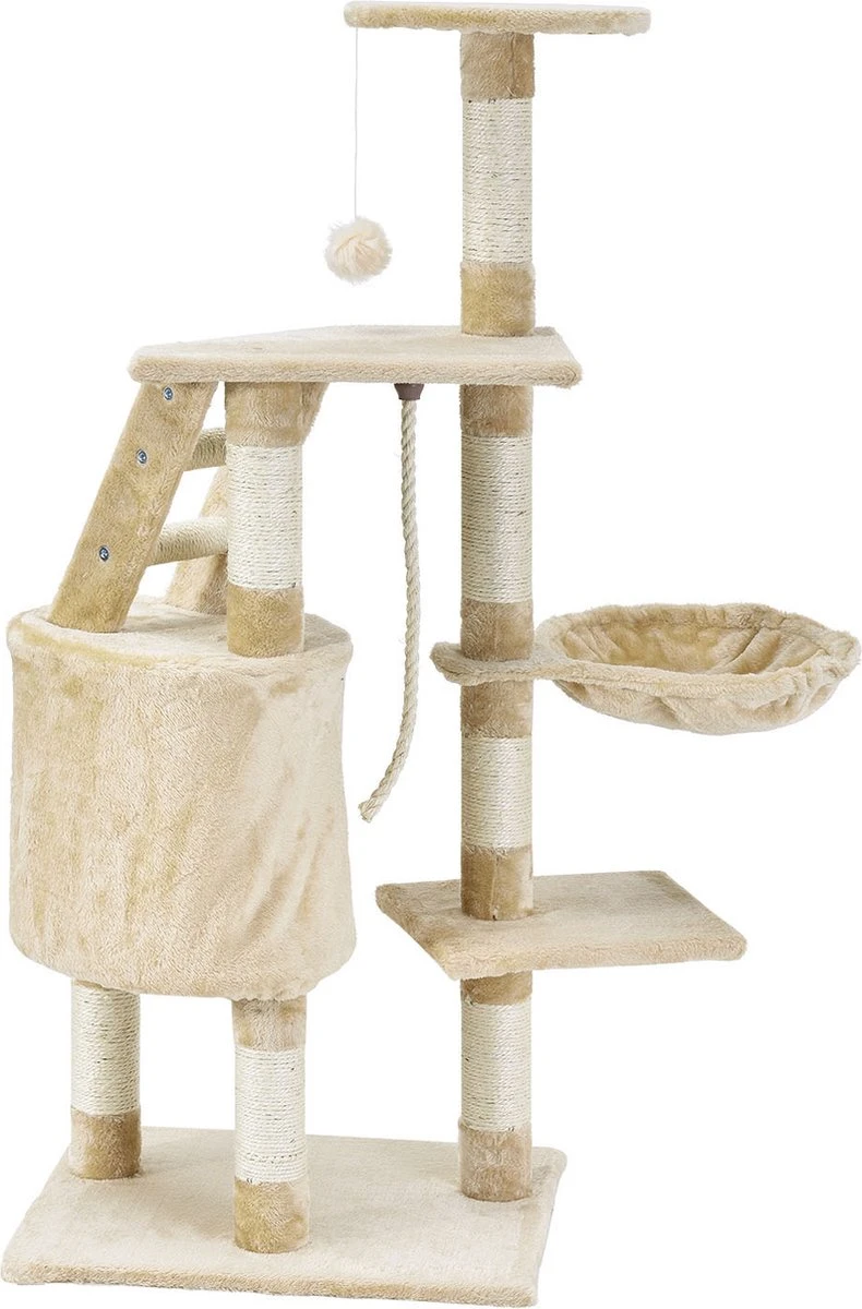 De middelhoge Buffy krabpaal in beige is het perfecte accessoire voor kattenbezitters. Met zijn uitgebreide uitrusting biedt hij katten tal van mogelijkheden om te spelen, rond te springen, te rusten en hun klauwen te scherpen. De in sisal gewikkelde stammen dienen als weerstand bij de klauwverzorging. Je kat zal zich helemaal op zijn gemak voelen en zal dol zijn op de krabpaal. Dankzij het compacte ontwerp neemt het 118 cm hoge kattenspeelgoed weinig ruimte in beslag in je huis/appartement. Zo is deze krabpaal gegarandeerd een waardevolle investering voor elke kattenliefhebber.