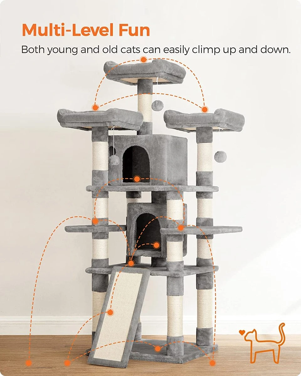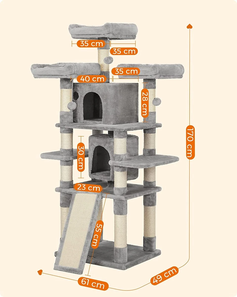 Een all-in-one speelplaats voor katten: Een ruime speelboom en meerdere zitstokken zorgen voor een super ervaring; speciaal pluizig speelgoed en een touw maken het spelen voor jouw kat nog leuker.