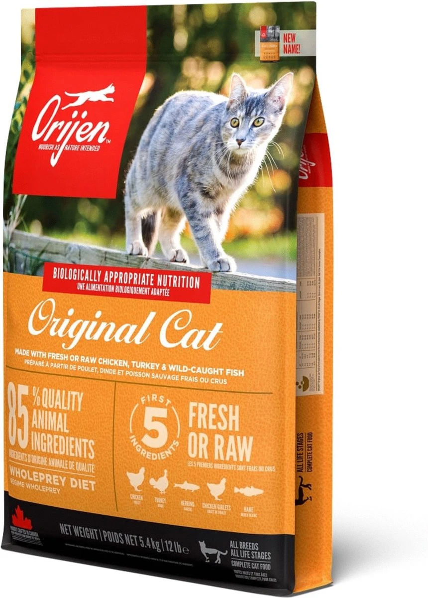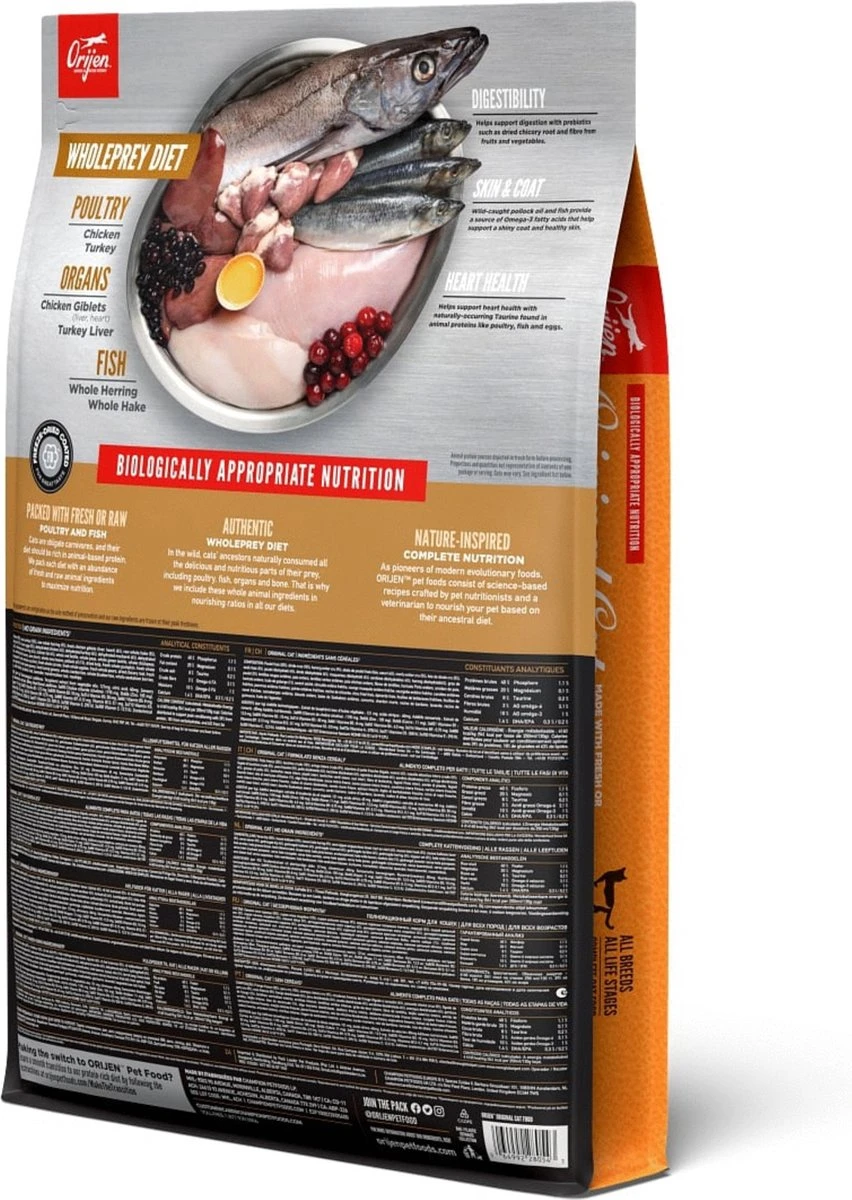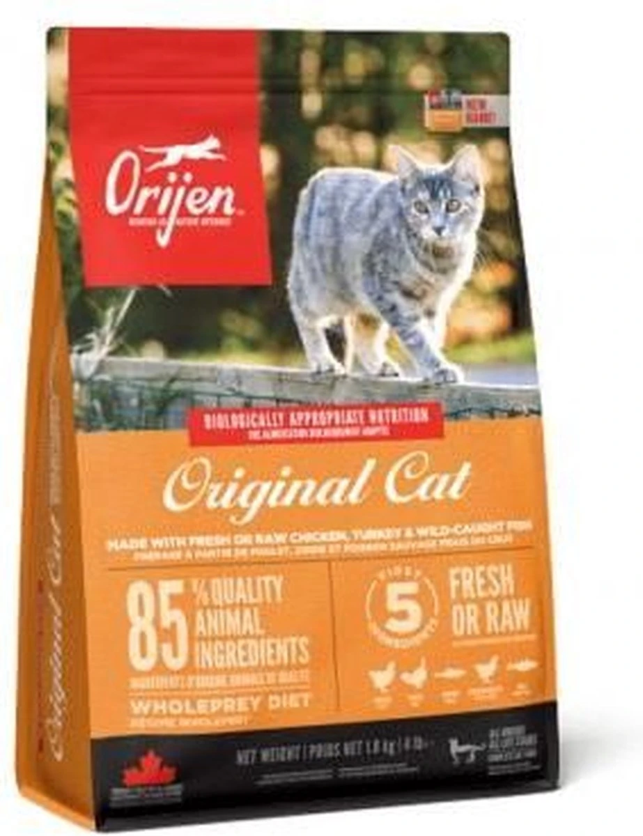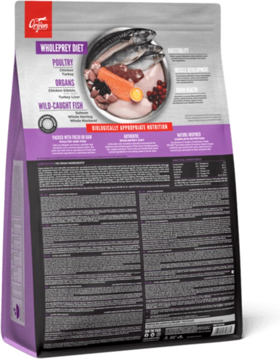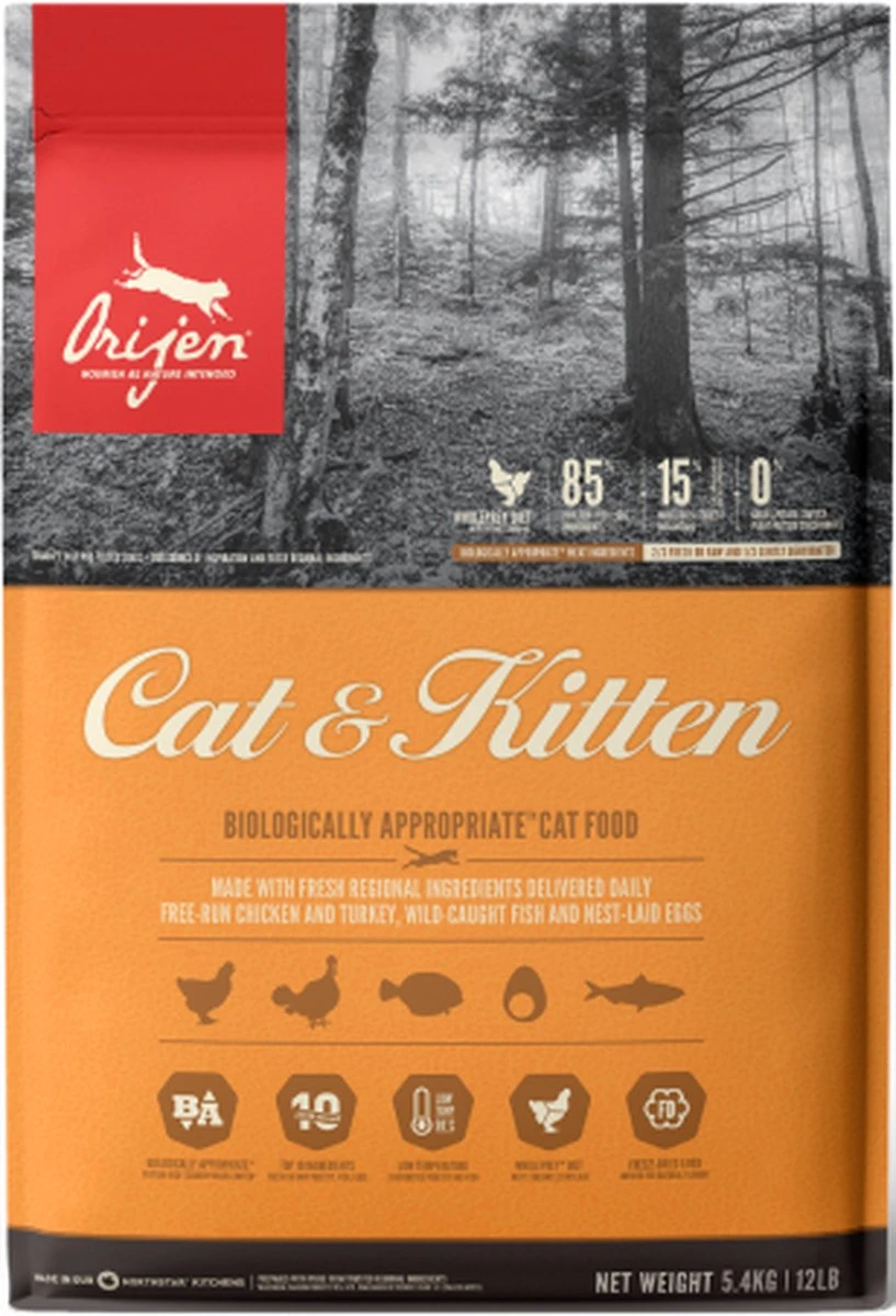 Ieder kat is geëvolueerd als carnivoor, met een natuurlijke behoefte aan een voeding rijk en gevarieerd van vers vlees en verse vis aangevuld met kleine hoeveelheden groenten, fruit en grassen. Daarom wordt Biologically Appropriate? Orijen Cat & Kitten bereid met scharrel kippen- en kalkoenvlees, scharreleieren, en in het wild gevangen vis. Allen gekweekt of gevangen op Canadese boerderijen of wateren en dagelijks vers geleverd. Daardoor is dit voer rijk aan hoogwaardige voedingsstoffen om jouw kat volledig te voeden!