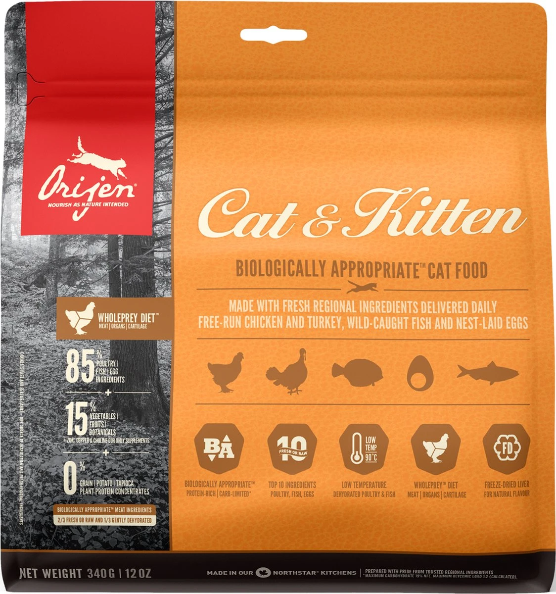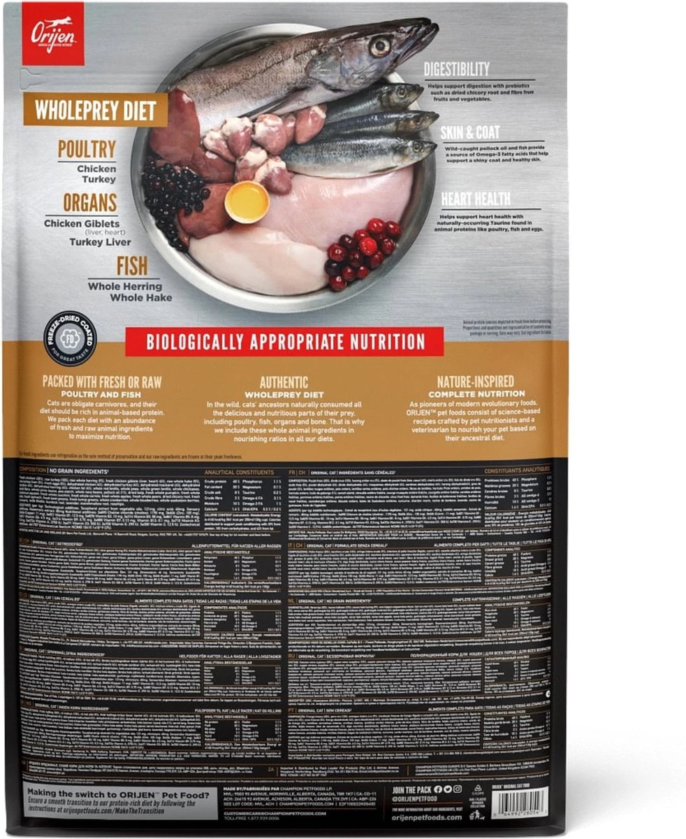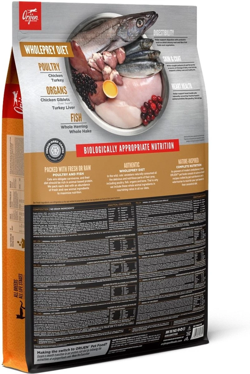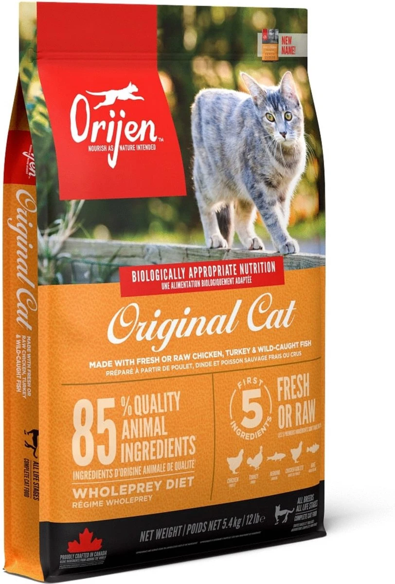Ieder kat is geëvolueerd als carnivoor, met een natuurlijke behoefte aan een voeding rijk en gevarieerd van vers vlees en verse vis aangevuld met kleine hoeveelheden groenten, fruit en grassen. Daarom wordt Biologically Appropriate? Orijen Cat & Kitten bereid met scharrel kippen- en kalkoenvlees, scharreleieren, en in het wild gevangen vis. Allen gekweekt of gevangen op Canadese boerderijen of wateren en dagelijks vers geleverd. Daardoor is dit voer rijk aan hoogwaardige voedingsstoffen om jouw kat volledig te voeden!