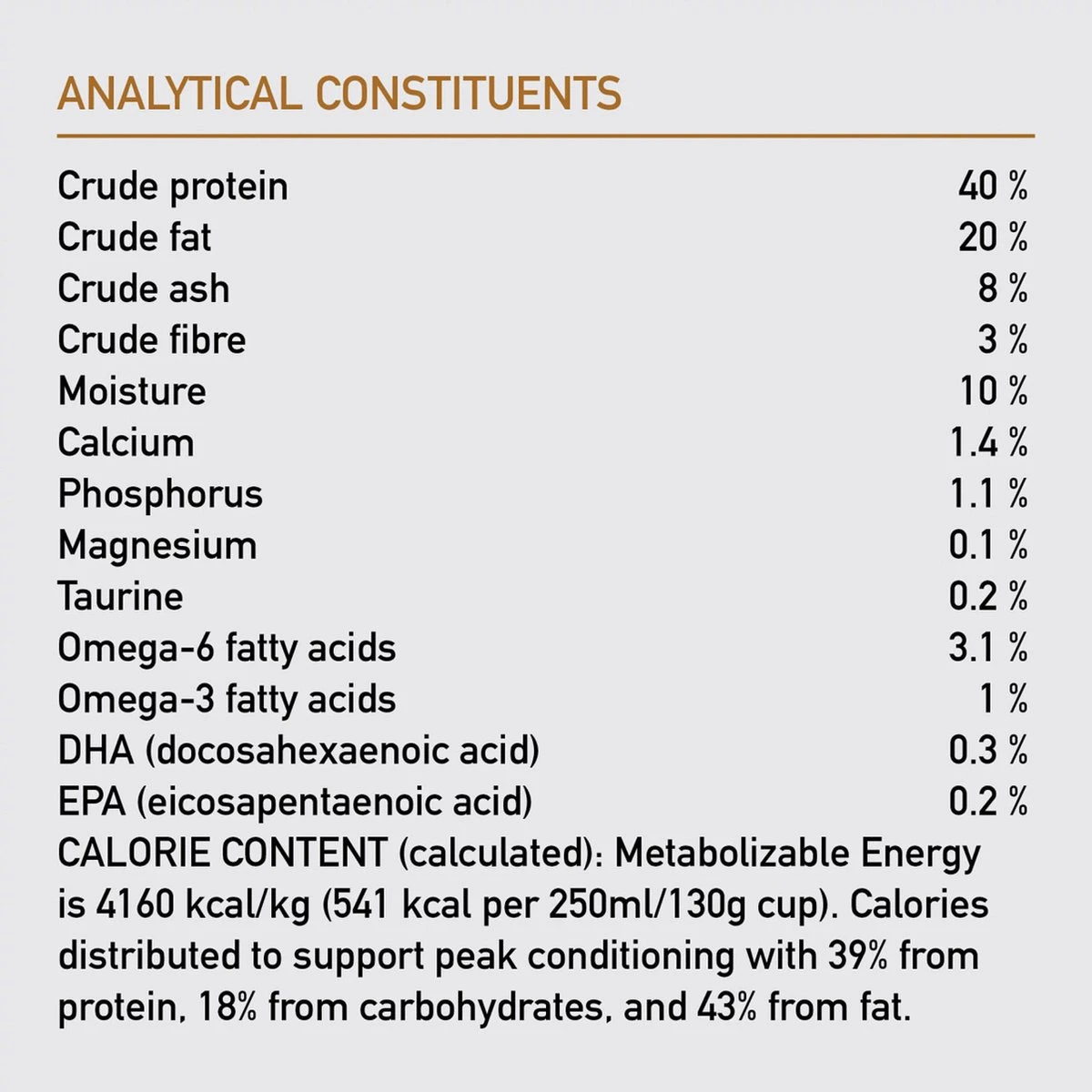 Ruw eiwit (min.) 42%, ruw vet (min.) 20%, ruwe as (max.) 8%, ruwe celstof (max.) 3%, vocht (max.) 10%, calcium (min/max.) 1.4 %, fosfor (min/max.) 1.1%, omega ? 6 (min.)* 2.5%, Omega ? 3 (min.)* 1.8%, DHA/ EPA (min.)* 1.0/0.7%, taurine (min)* 0,2%, Magnesium (max.)* 0.09%