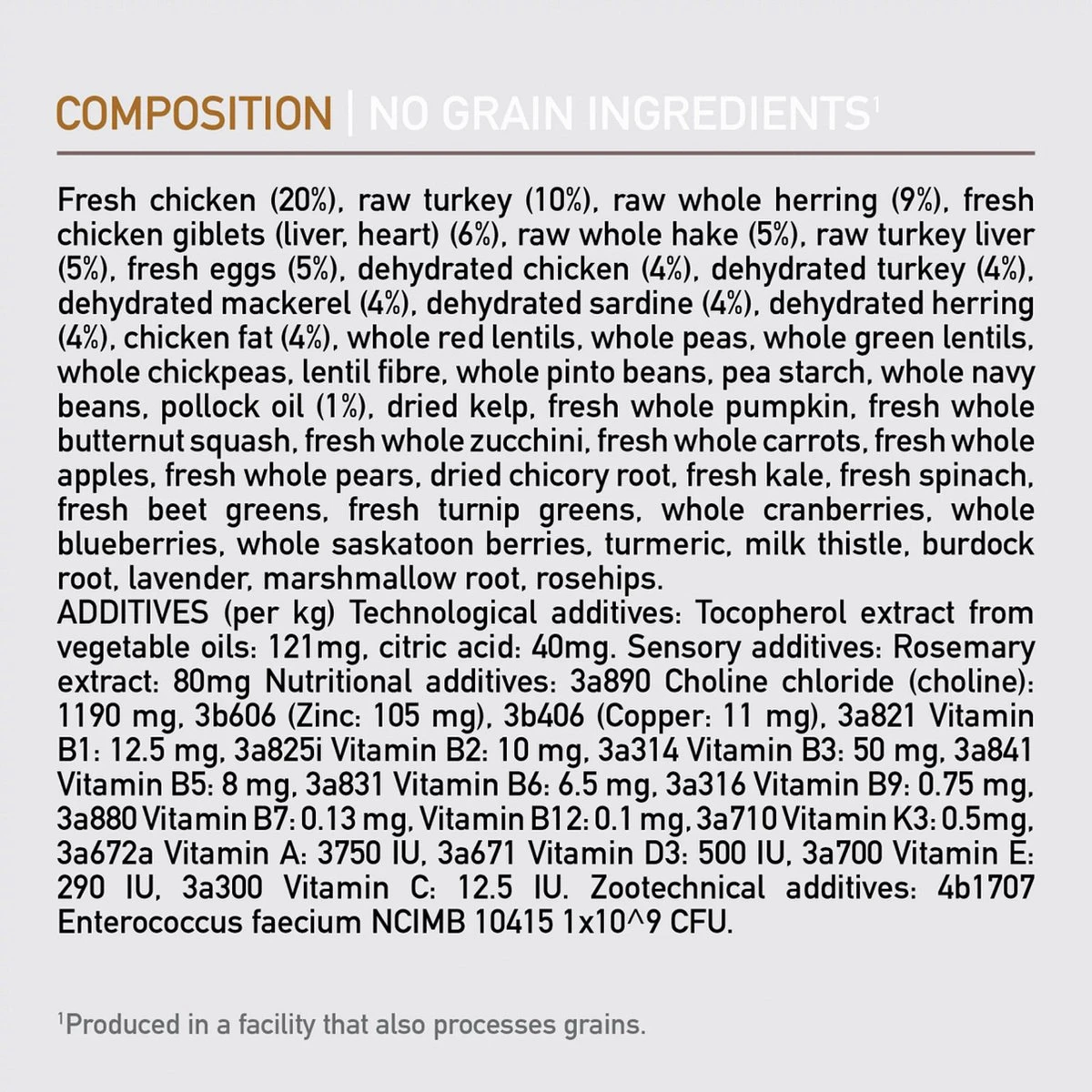 Vers kippenvlees (20%)*, gedroogd kippenvlees (15%), verse kippenlever (4%)*, verse hele haring (4%)*, vers kalkoenvlees (4%)*, gedroogd kalkoenvlees (4%), verse kalkoen lever (3%)*, verse hele eieren (3%)*, verse gefileerde snoek (3%)*, verse hele zalm (3%)*, verse kippen hartjes (3%)*, kippen kraakbeen (3%), gedroogde haring (3%), gedroogde zalm (3%), kippenlever olie (2%), *kippen vet (2%), rode linzen, groene erwten, groene linzen, alfalfa, gedroogde zeewier, pompoen, Butternut Squash, blad spinazie, wortelen, Red Delicious appelen, Barlett peren, veenbessen, chichorei wortel, paardebloem wortel, kamille, pepermunt blad, gember, komijn, kurkuma, rozenbottels, gevriesdroogde kippenlever, gevriesdroogde kalkoenlever, gevriesdroogde kip, gevriesdroogde kalkoen.