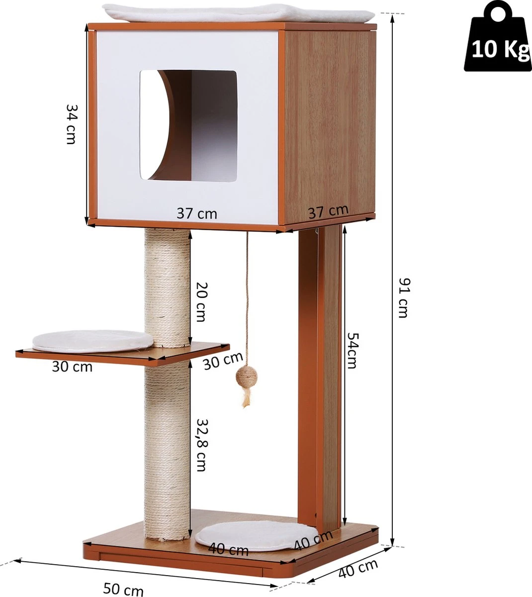De krabpaal van PawHut wordt de favoriete plek van jouw kat: Met verschillende platforms, een grot, zachte kussens, sisal palen en een hangende speelbal vervult hij alle behoeften van jouw huistijger. Door het ontwerp van houtkleurig MDF-plaat en witte elementen past de krabpaal ook goed bij jouw interieur. Nieuw in deze bijgewerkte versie van onze kattenklassiekers zijn de drie extra kussens. Nu hebben jouw kleine huisgenoten nog meer heerlijke plekjes om te liggen. Eigenschappen: · Stevige constructie gemaakt van hoogwaardig MDF · Veel activiteiten: stoeien, krabben, klimmen en uitrusten · Afgeronde hoeken en randen om veilig te kunnen spelen · 4 zachte kussens om uit te rusten · Met kattengrot, 3 platforms, paal omwikkeld met sisal en hangende speelbal · Eenvoudige montage Technische gegevens: · Materiaal: dennenhout, P2 klasse MDF, sisaltouw · Kleur: naturel + wit · Totale afmetingen: 50 l x 40 b x 91 h cm · Grootte van de grot: 37 l x 37 b x 34 h cm · Kussens in de grot: 34 l x 34 b x 1 d cm · Hoogte steunpaal: 54 cm · Afmetingen middelste platform: 30 l x 30 b x 1 d cm · Hoogte van de sisalpalen: 20 cm (bovenste gedeelte), 32,8 cm (onderste gedeelte) · Bodemplaat: 40 l x 40 b x 3 d cm · Gewicht: 8 kg · Maximaal draagvermogen: 10 kg · Omvang van de levering: 1 x krabpaal · Verzendbriefje: Geen verzending naar Nederlandse eilanden.