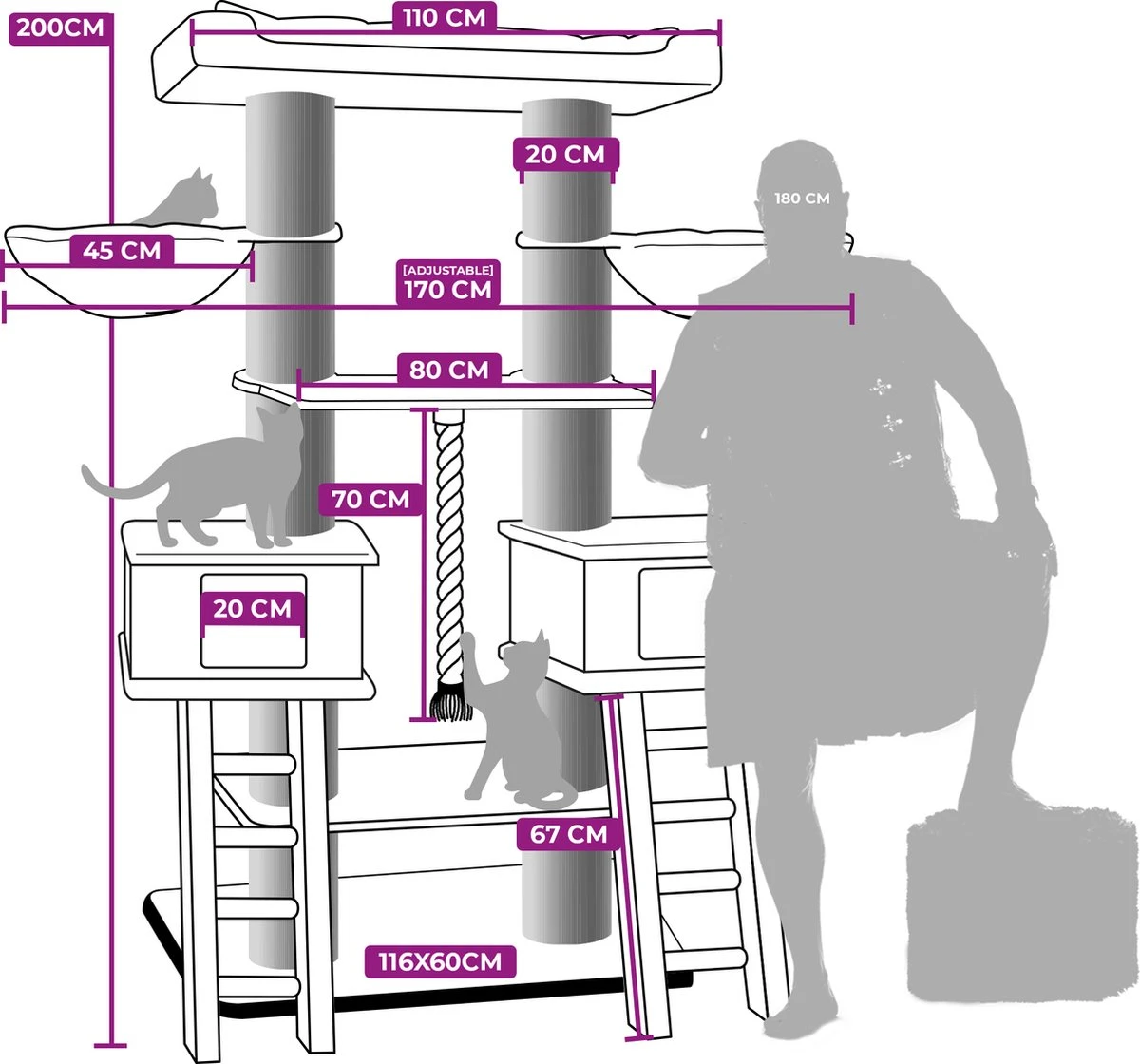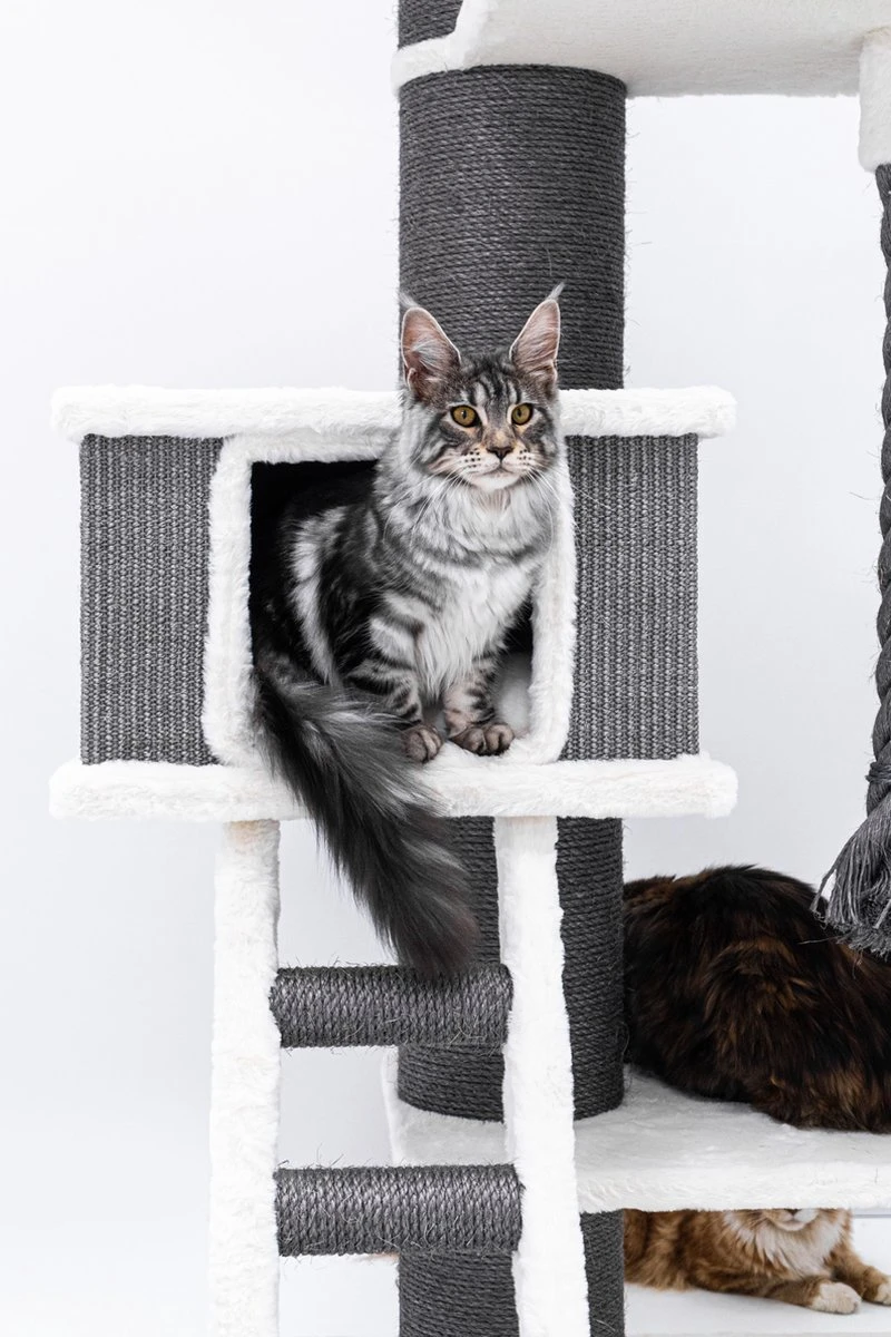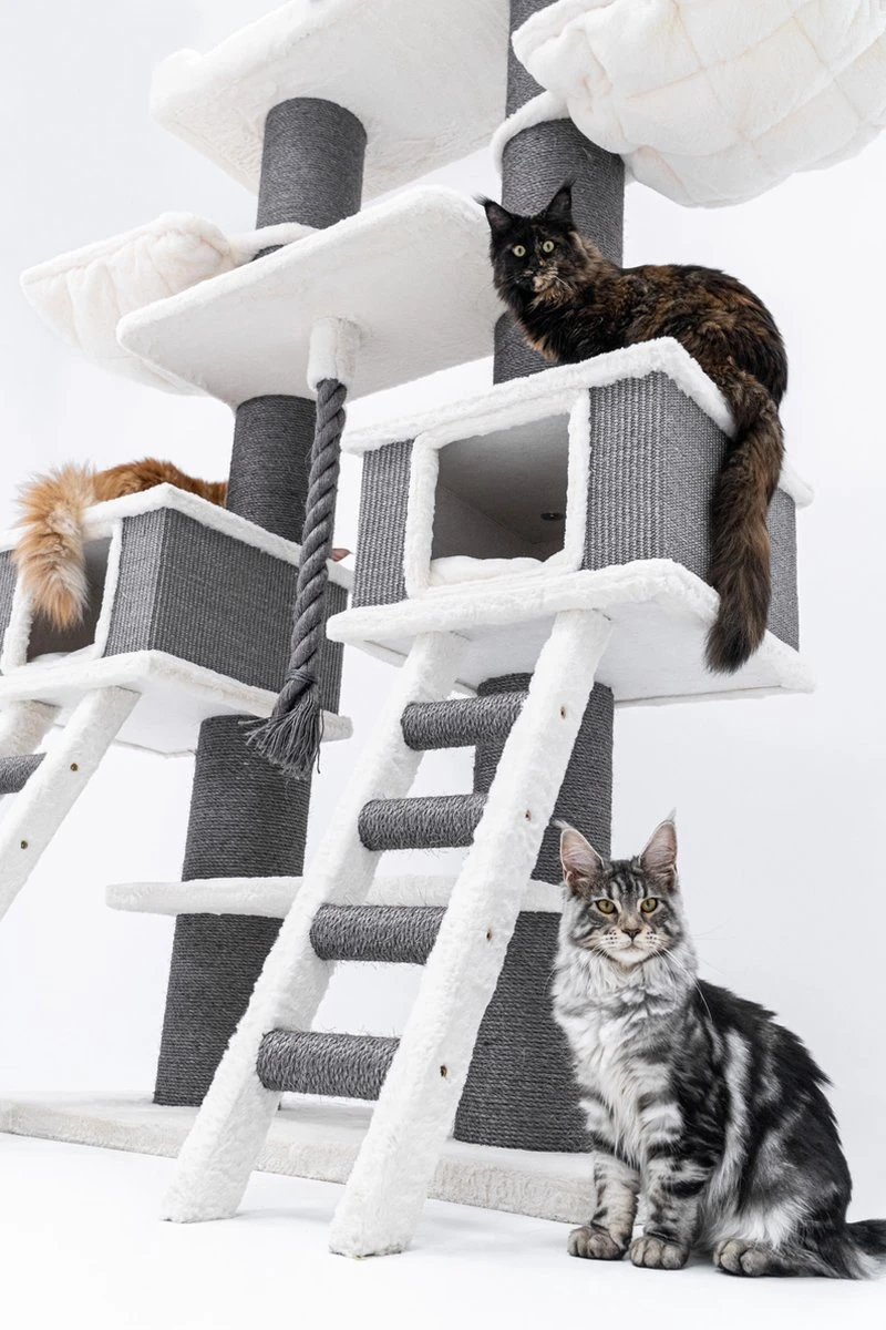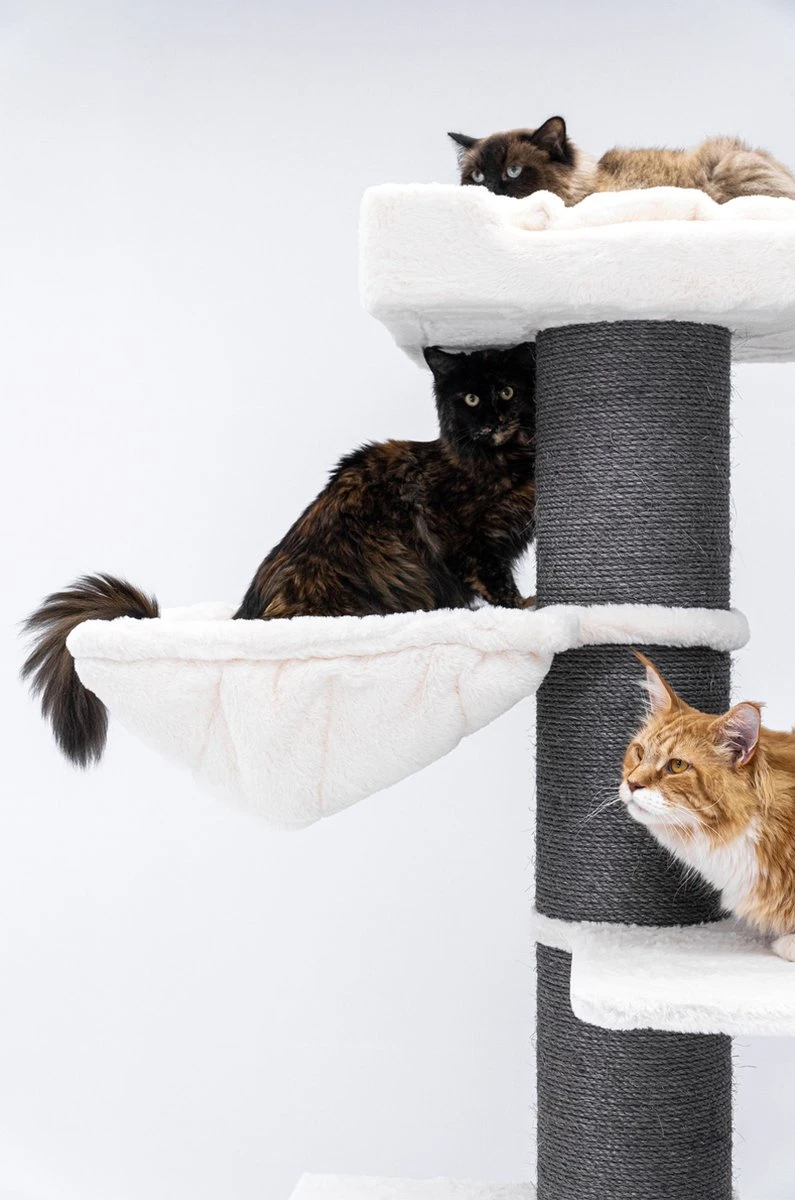 Het kan voor echte kattenliefhebbers nooit goed genoeg zijn voor hun Rebels. Daarom heeft ons designteam krabpaal Ragdoll 200 ontworpen. Maar het woord ‘krabpaal’ dekt de lading bij lange na niet. Met twee royale kattenhuisjes mét chique opstap, doorgestikte extra grote hangmatten en een extra brede loungemand bovenin noemen we deze topper liever een kattenparadijs! Want dat is het. Een feestje voor elke kat om aan te krabben, in te relaxen en om de het hele huishouden in de gaten te houden.