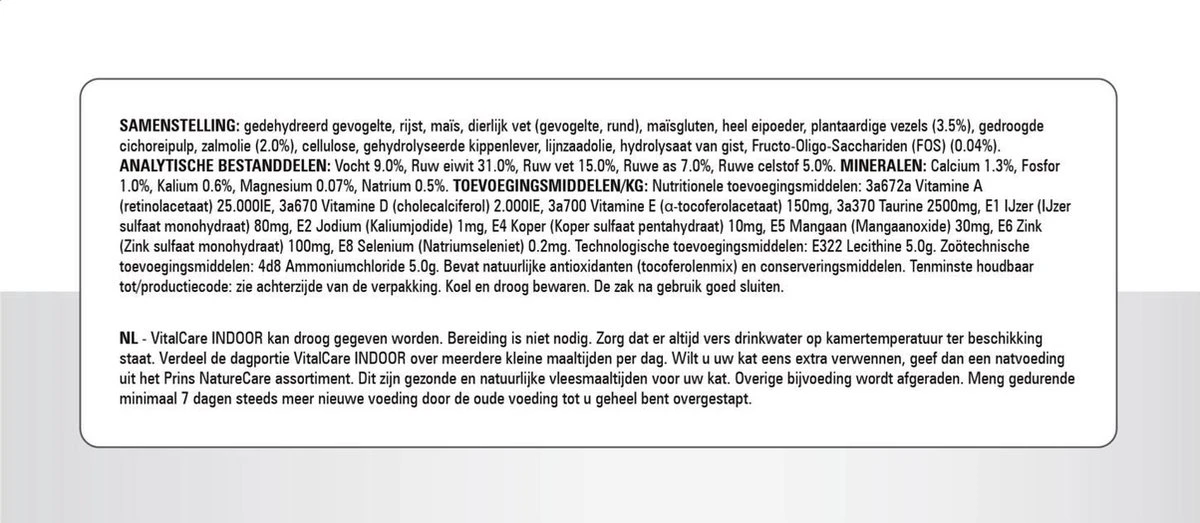 VitalCare Indoor is een hoogwaardige voeding speciaal voor katten die in huis leven. Binnenkatten zijn vaak wat minder actief en hebben daarom een lagere voedingsbehoefte. Het hoge eiwitgehalte zorgt dat de spieren intact blijven en het lagere vetgehalte helpt uw kat op gewicht te blijven.Hierdoor is de VitalCare Indoor ook bijzonder geschikt voor gesteriliseerde of gecastreerde katten. Door toevoeging van natuurlijke vezels vormen haren die worden ingeslikt tijdens het wassen geen haarballen in de maag. De vezels zorgen voor een natuurlijke afvoer via het maag-darmkanaal van de kat. Hierdoor verlaten de haren het lichaam met de ontlasting en geven ze geen problemen meer.Veel binnenkatten hebben last van gebitsproblemen. De vorm van het brokje is zo ontworpen dat de kat beter moet kauwen. Dit helpt tandsteen en tandplak voorkomen. Urineverzurende stoffen helpen blaasgruis te voorkomen.