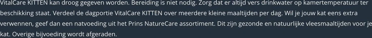 Prins Vitalcare Kitten is een hoogwaardige voeding speciaal voor jonge katjes die extra energie nodig hebben om te groeien. Opgroeiende kittens leggen de basis voor de rest van hun leven. Niet alleen een optimale groei van spieren en botten, maar ook een goede weerstand is van belang om gezond volwassen te worden. Zodra je kitten de leeftijd van 10-12 maanden heeft bereikt, kun je overstappen naar VitalCare Adult of VitalCare Indoor. Meng gedurende minimaal 7 dagen met steeds meer nieuwe voeding door de oude voeding tot je geheel bent overgestapt. VitalCare Kitten is door zijn hoogwaardige energiegehalte ook bijzonder geschikt voor drachtige en zogende katten.