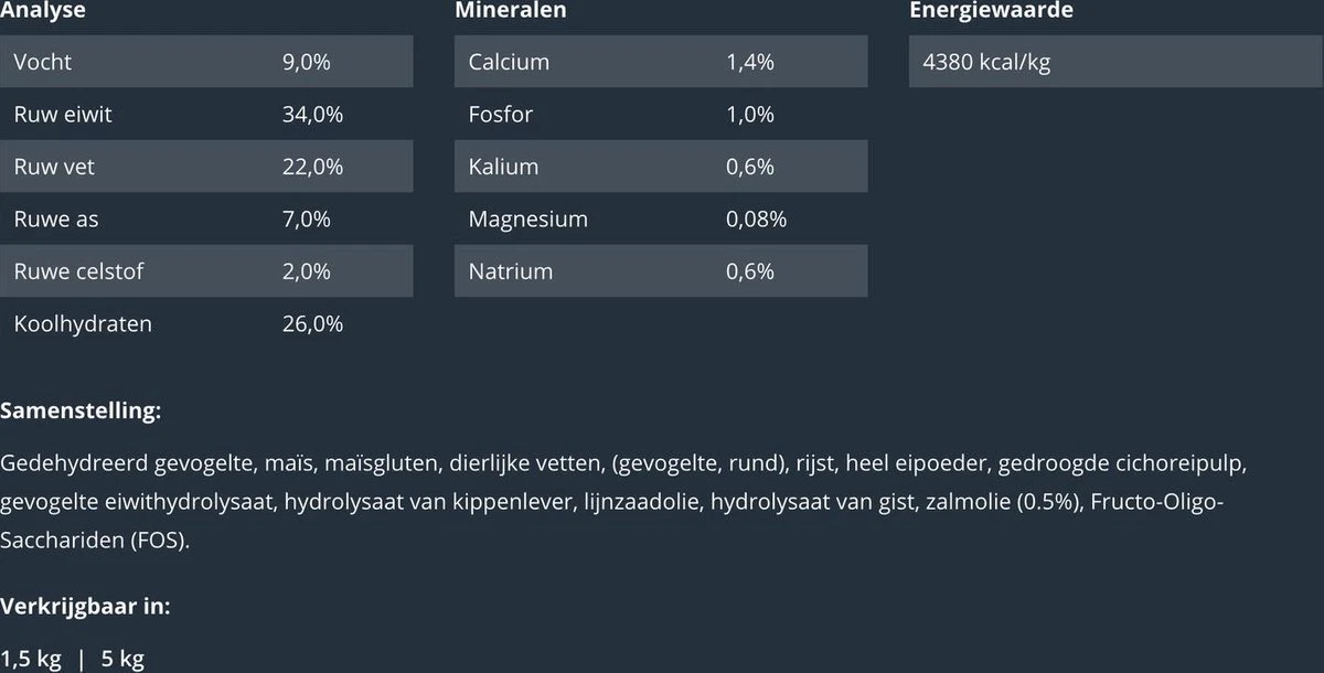 | Voedingswaarde | Gevogeltemeel, maïs, dierlijke vetten, maïsgluten, rijst, heel eipoeder, cichoreipulp, caseïne, hydrolysaat van kippenlever, sojaolie, hydrolysaat van gist (bron van Manno-Oligo-Sachariden), zalmolie, Fructo-Oligo-Sacchariden (FOS), lecithine |