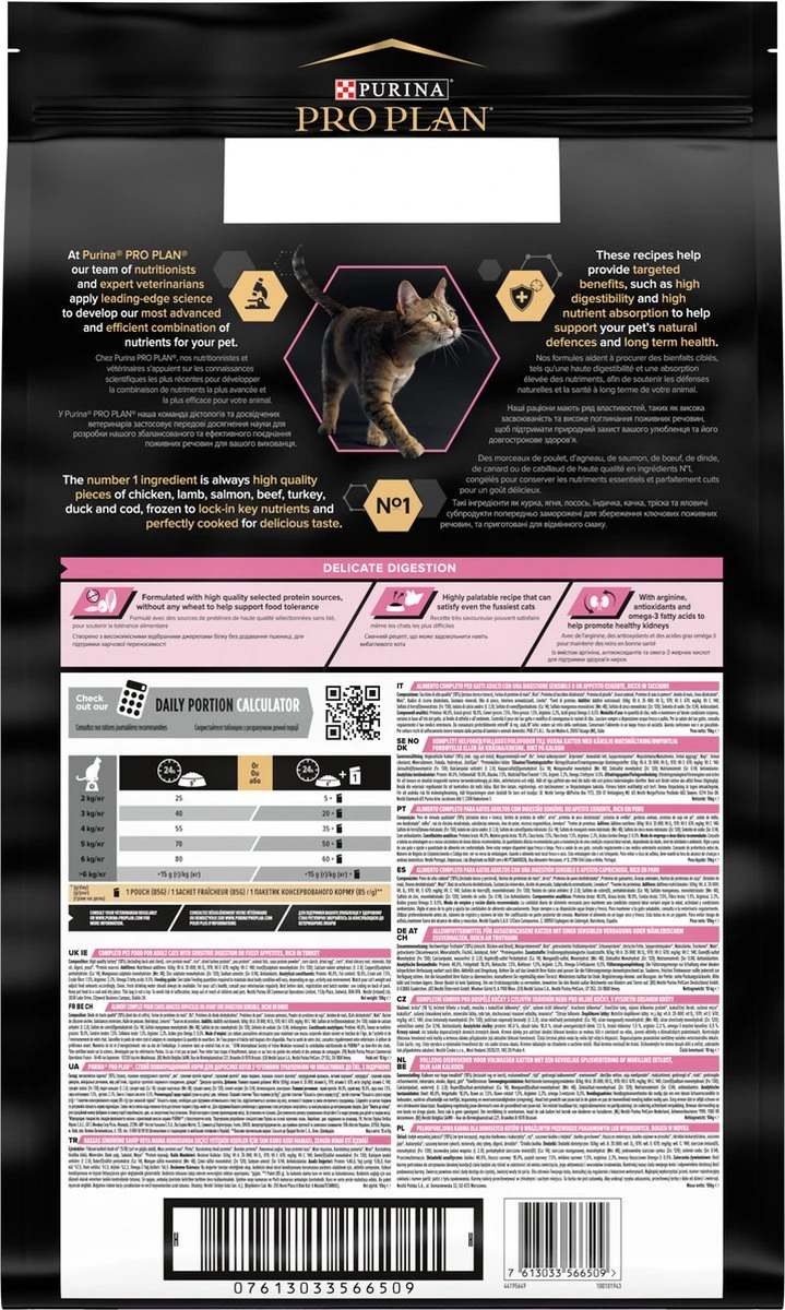 PURINA® PRO PLAN® Delicate Digestion kattenvoer rijk aan kalkoen is speciaal geformuleerd met hoogwaardige geselecteerde eiwitbronnen, zonder tarwe om voedseltolerantie te ondersteunen en de spijsvertering te bevorderen.
