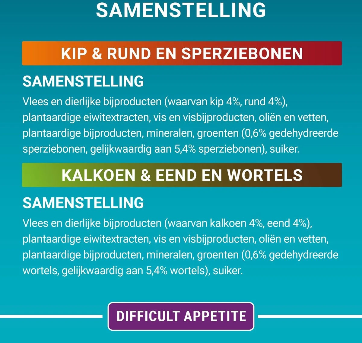 | Analytische bestandsdelen | Analytische bestanddelen Fijne Malse reepjes in Saus met KIP & RUND en Sperziebonen: Vocht: 79%, Eiwit: 12%, Vetgehalte: 3,5%, Ruwe as: 2,2%, Ruwe celstof: 0,3%. Analytische bestanddelen Fijne Malse reepjes in Saus met KALKOEN & EEND en wortelen: Vocht: 79%, Eiwit: 12%, Vetgehalte: 3,5%, Ruwe as: 2,2%, Ruwe celstof: 0,3%. |