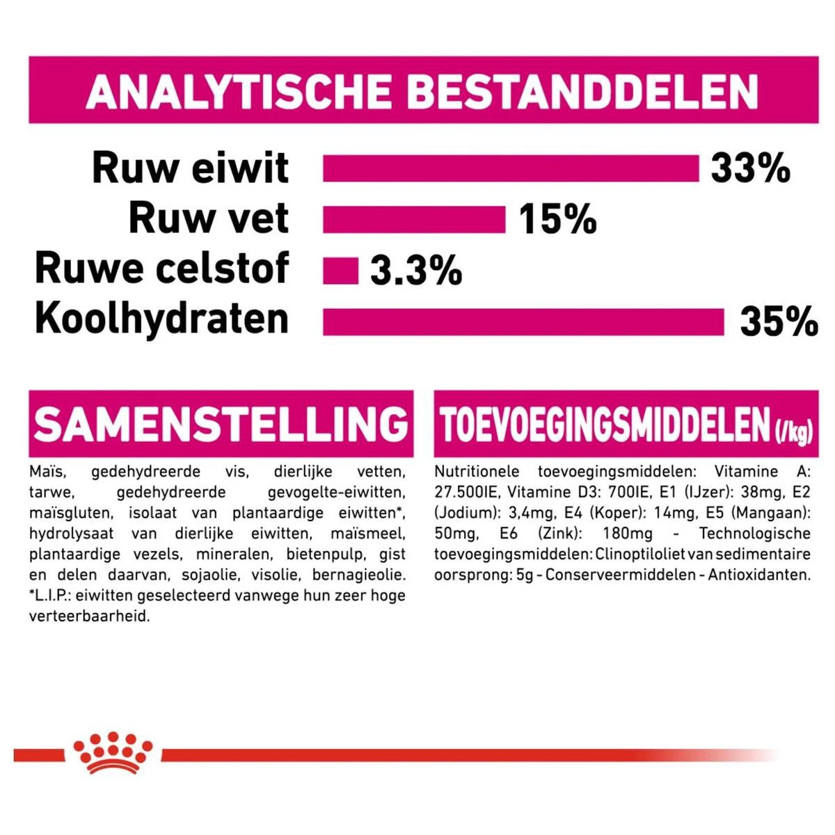 | Analytische bestandsdelen | Analyse: Ruw eiwit: 33.00% – Ruw vet: 15.00% – Ruwe as: 8.20% – Ruwe celstof: 3.30% |