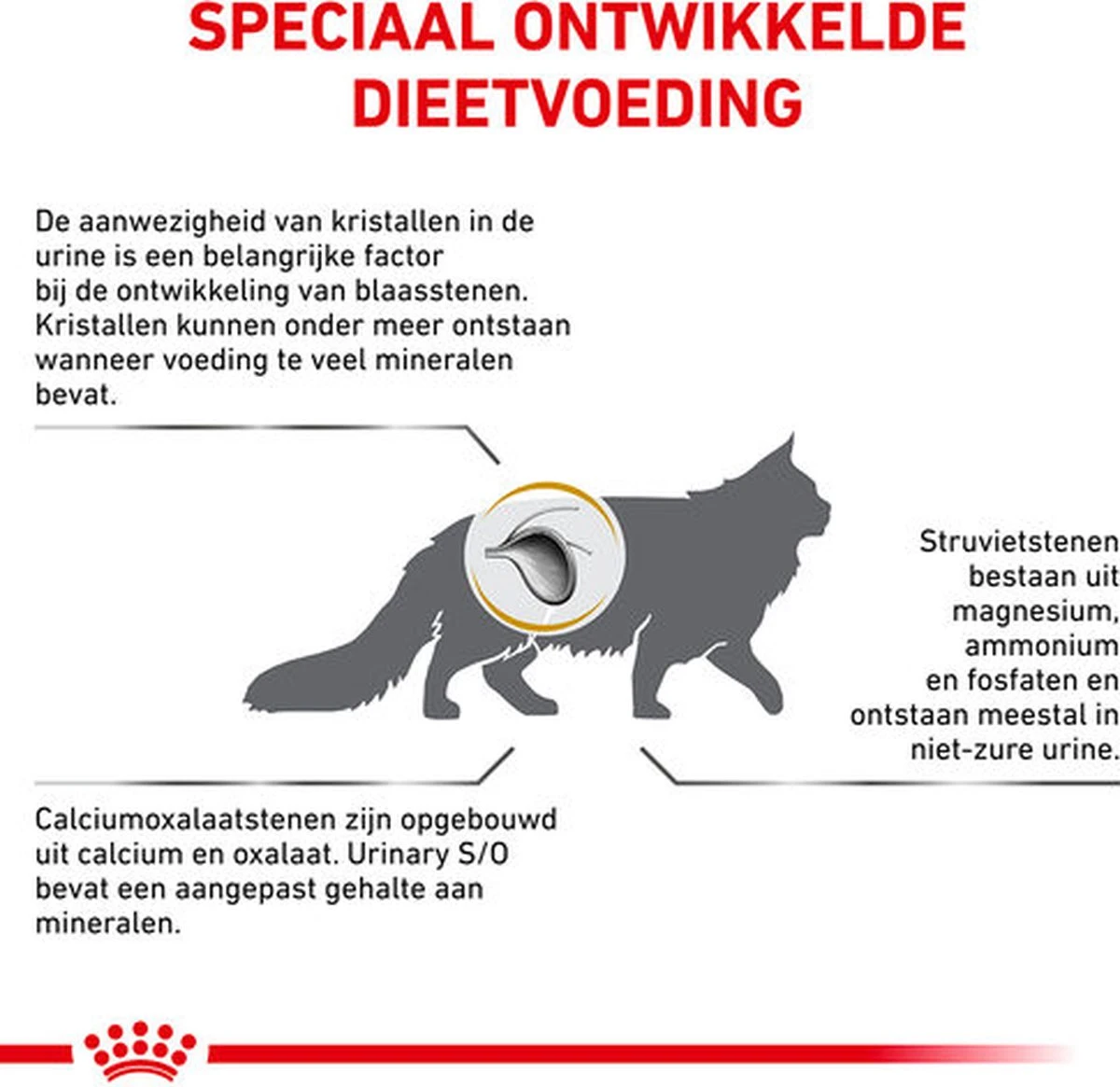Bij honden en katten komen regelmatig aandoeningen aan de lagere urinewegen voor. Dit zijn aandoeningen aan de urineleiders, de blaas of de urinebuis. Een belangrijke oorzaak van urinewegproblemen is de vorming van blaasstenen. Wanneer je huisdier last heeft van blaasstenen, zal je dierenarts in de meeste gevallen een speciale dieetvoeding en/of medicijnen voorschrijven en een aantal verzorgingsadviezen geven. Royal Canin Urinary S/O is zo’n dieetvoeding. Royal Canin Urinary S/O Diet is speciaal ontwikkeld ter ondersteuning van de behandeling van aandoeningen van de lagere urinewegen. Royal Canin Urinary S/O Diet helpt bij het oplossen van struvietstenen/-kristallen (blaasgruis) en bij het voorkomen van de vorming van nieuwe struvietstenen/-kristallen. Daarnaast gaat deze voeding de vorming van calciumoxalaatstenen tegen.