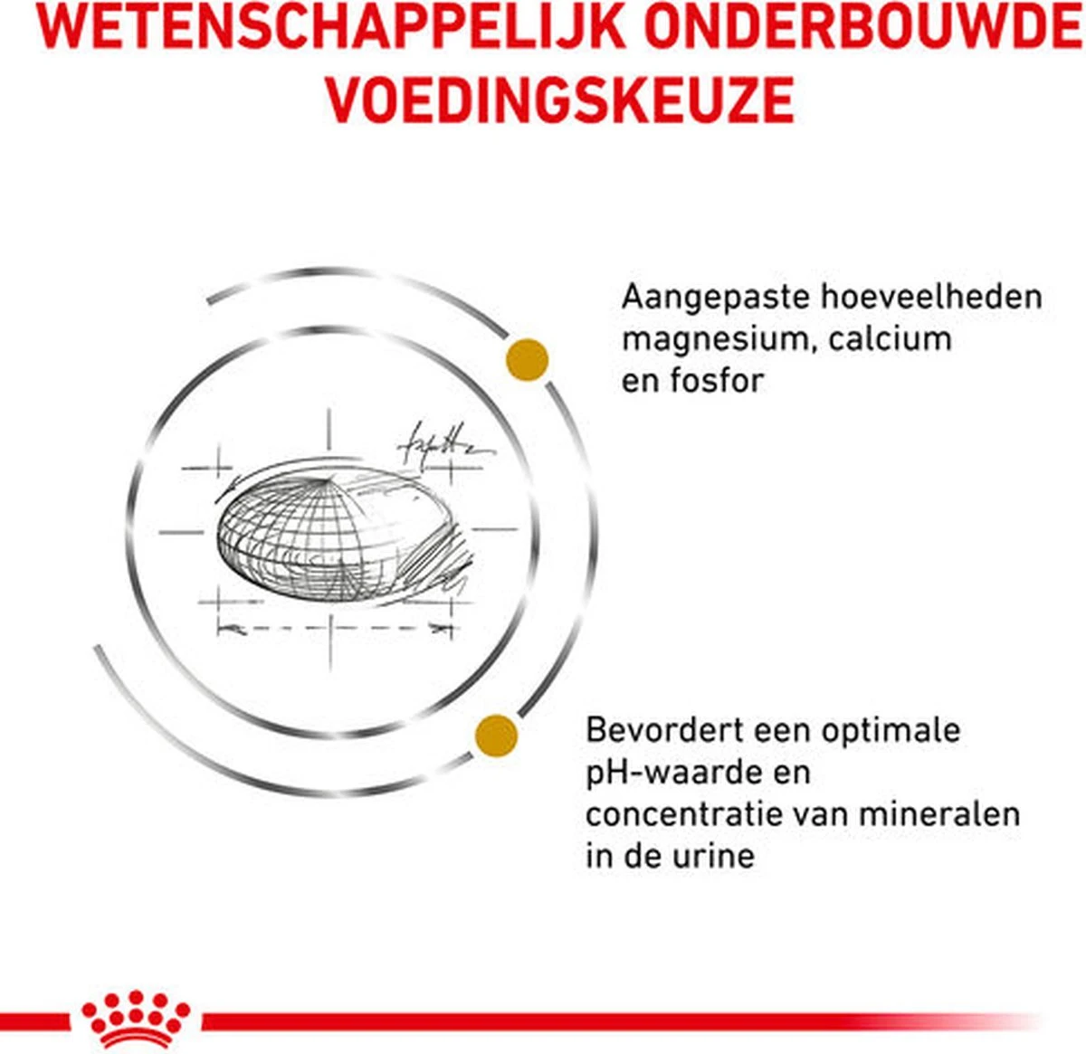 - De speciale samenstelling draagt bij aan het voorkomen van zowel struviet- als calciumoxalaatstenen en het oplossen van struviet.