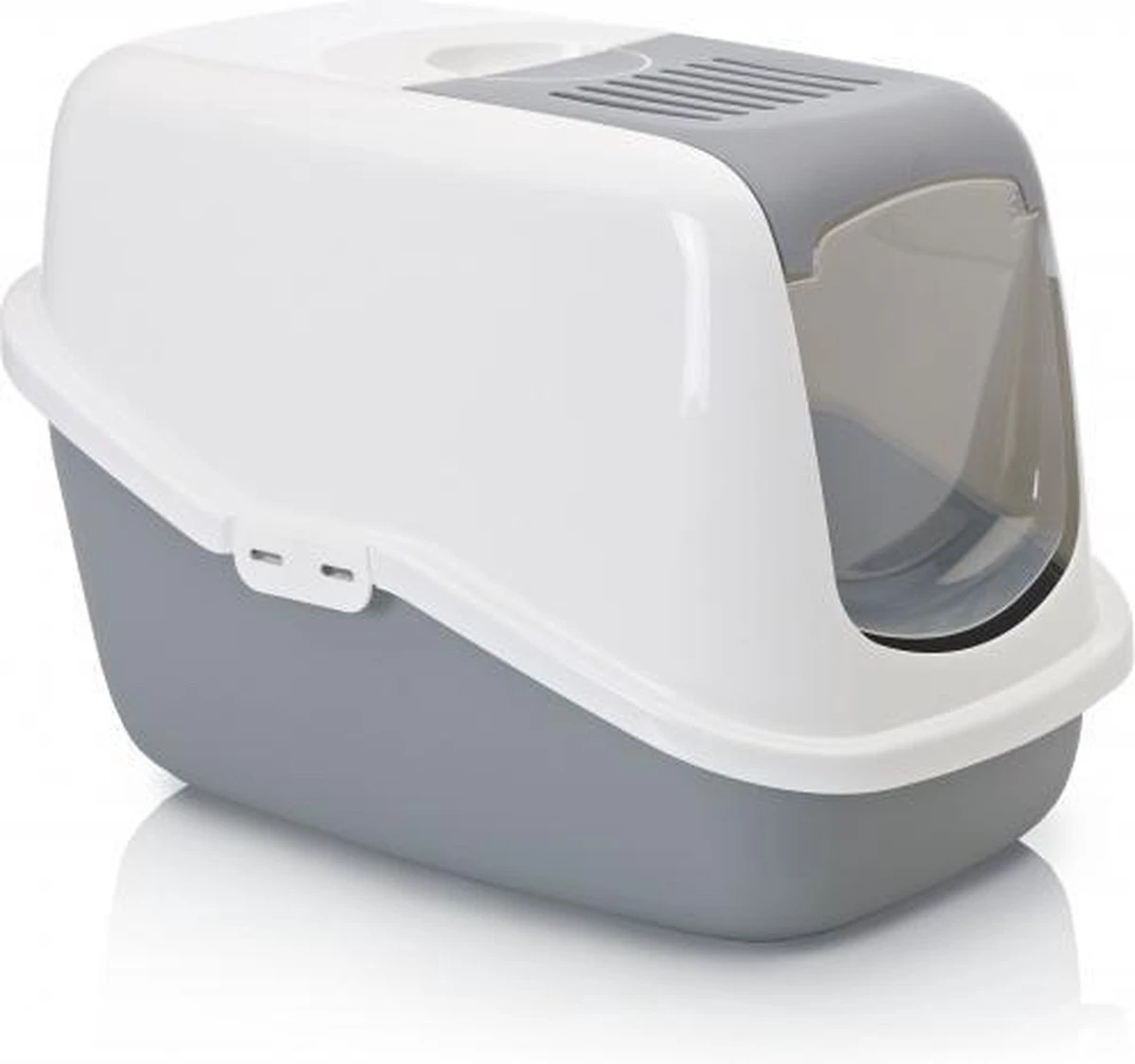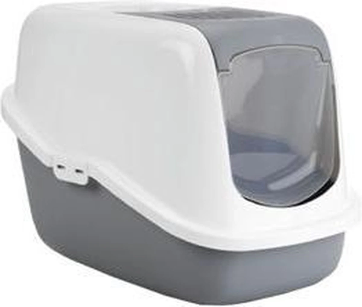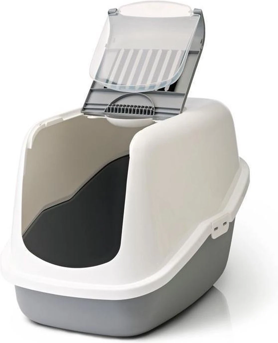 Een mooigevormde kattenbak in een modieuze kleurstelling. Doordat het deurtje samen met het binnenste gedeelte van de bovenzijde in een handomdraai los te klikken is hoeft u niet meer de complete bovenzijde van de onderbak los te maken om deze schoon te maken. Het los geklikte gedeelte kunt u omhoog duwen zodat u er makkelijk bij kunt. Kleur onderbak: glanzend grijs, kleur bovenzijde: glanzend wit met een grijs middenstuk.