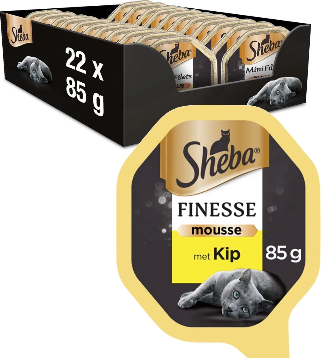 Deze verpakking bevat 22 kuipjes Sheba Finesse Mousse kattenvoer in de smaak kip.