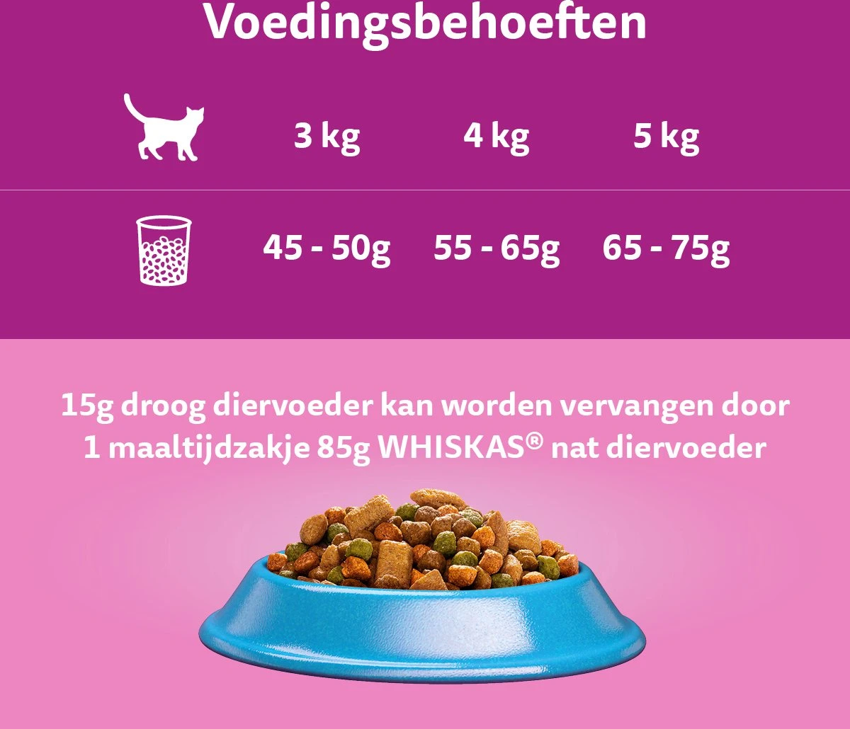 En dat niet alleen… De WHISKAS® brokjes zijn onweerstaanbaar. Krokant vanbuiten en heerlijk mals vanbinnen. Elk brokje zit vol smaak, natuurlijke ingrediënten en essentiële voedingsstoffen. Deze dragen bij aan gezonde urinewegen, een gezonde huid en vacht, schone tanden en een sterk gezichtsvermogen. Als dat geen lang en gelukkig leven vol smullen wordt!